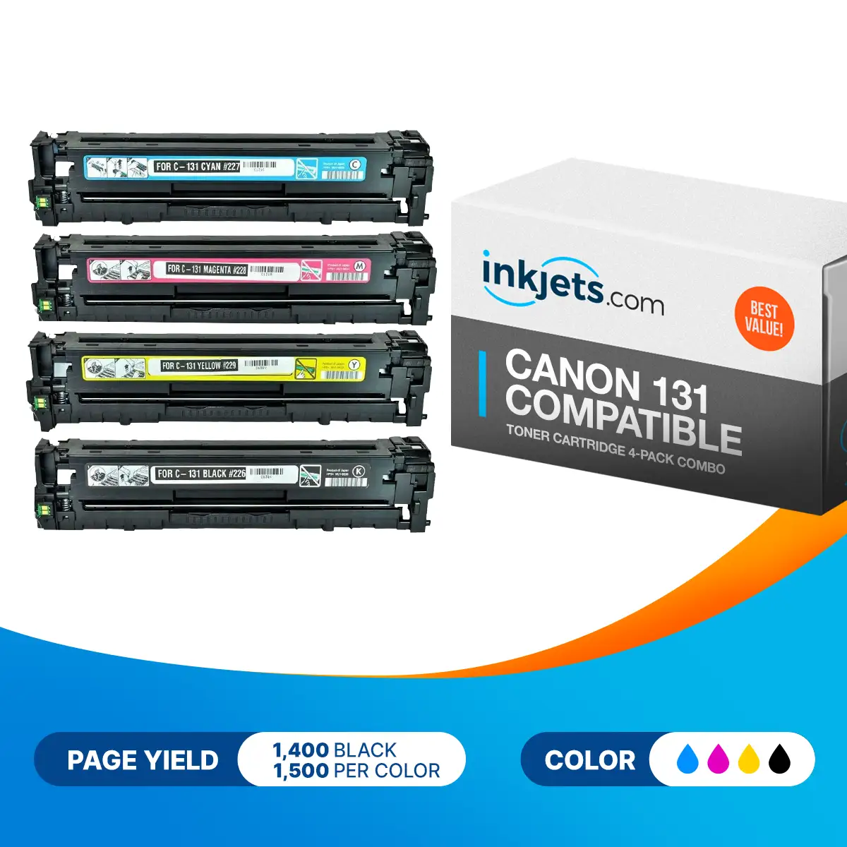 Now is the perfect time to switch from overpriced OEMs to the top-tier Compatible Canon 131 Toner Cartridge 4-Piece Combo Pack from Inkjets.com. It comes with one black unit offering an excellent 2400-page yield and one cyan magenta and yellow unit which can provide up to 1500 each. With these cartridges you can effectively handle even the biggest and most complex print jobs in the workplace. What's more they can create the same razor-sharp professional-quality output of their brand-name counterparts but at a fraction of the cost.
