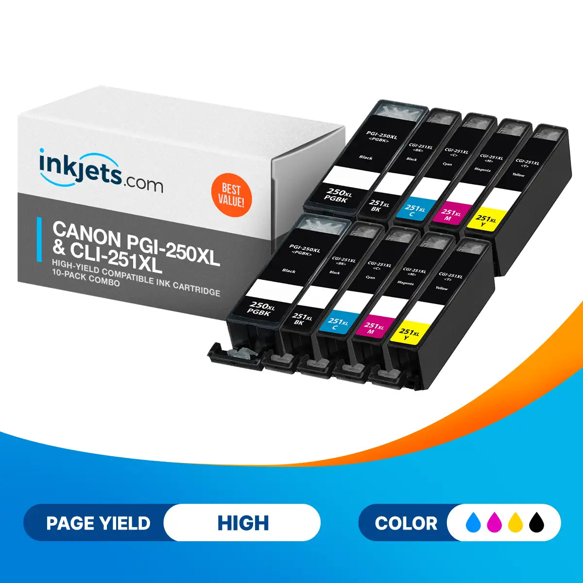 The Compatible Canon 251 XL Ink work perfectly with Canon PIXMA printers. These include the PIXMA MG5450 PIXMA MG6350 PIXMA MG7150 and PIXMA MX925. As additional protection to your investment Inkjets.com has got this 10-piece combo pack covered with a solid 1-year warranty money-back guarantee and free returns. Enjoy greater savings and better prints when you shop today.