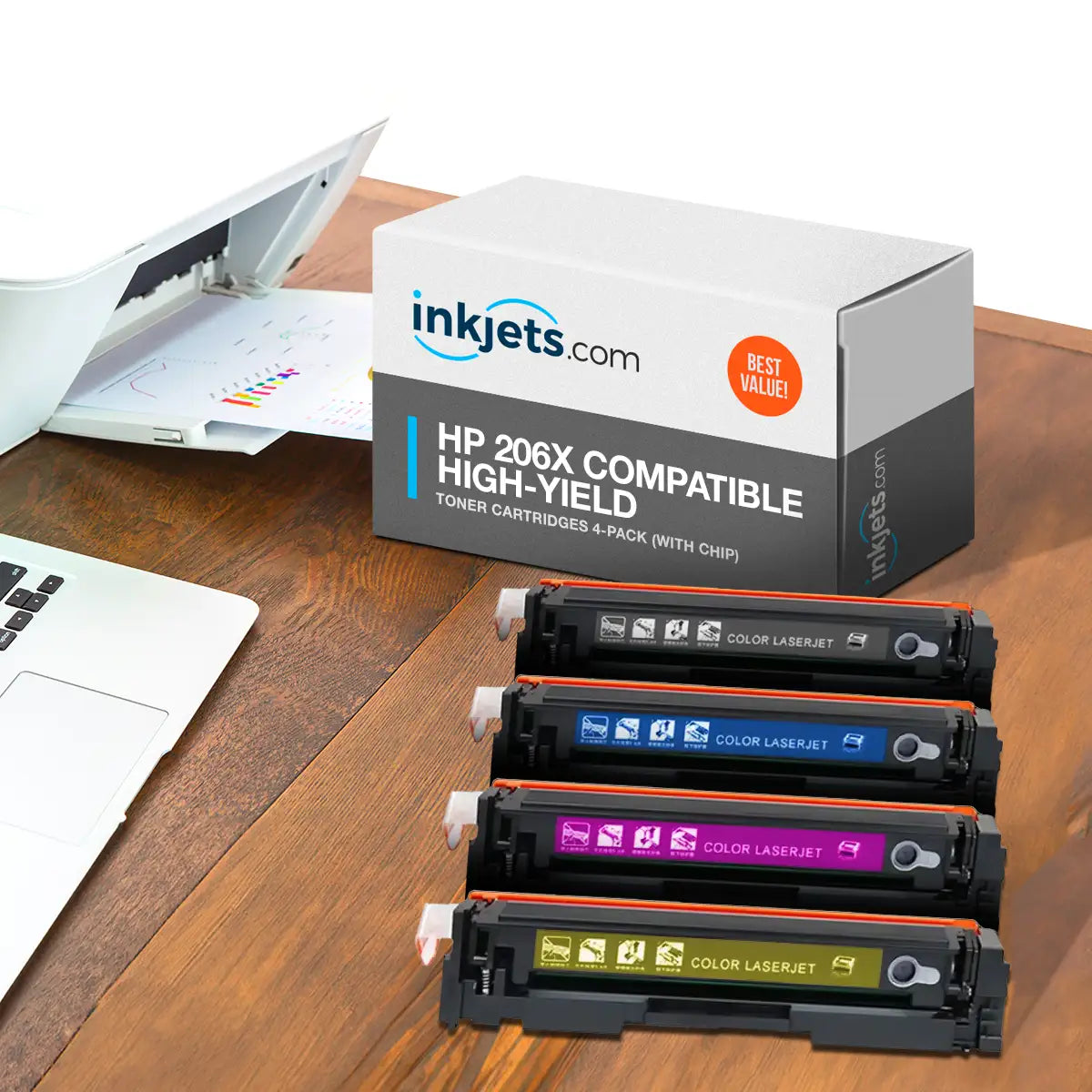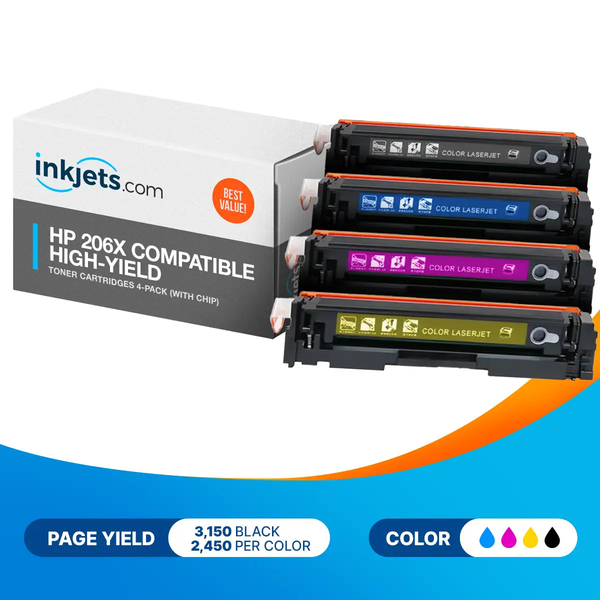 The HP 206X Compatible High-Yield Toner Cartridges 4-Pack is the ideal toner solution for busy offices. This practical combo package includes one of each color, providing a comprehensive printing solution when paired with your compatible HP printer model. Our generic toner cartridges provide all the quality you need, without the high cost of original OEM products. Designed to replace OEM cartridges like 206X 206A W2110X W2111X W2113X W2112X W2110A W2111A W2113A W2112A, our compatible cartridgers provide you with fewer replacement frequency and more efficient operations thanks to its long lasting page yield. Unbeatable quality comes standard with every purchase, along with our 1-year warranty from date of purchase and money back guarantee. Make the smart investment today with With Chip’s HP 206X Compatible High-Yield Toner Cartridges 4-Pack.