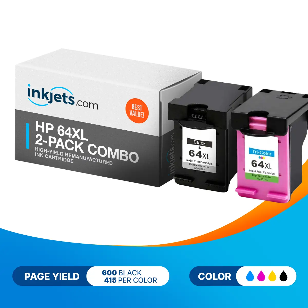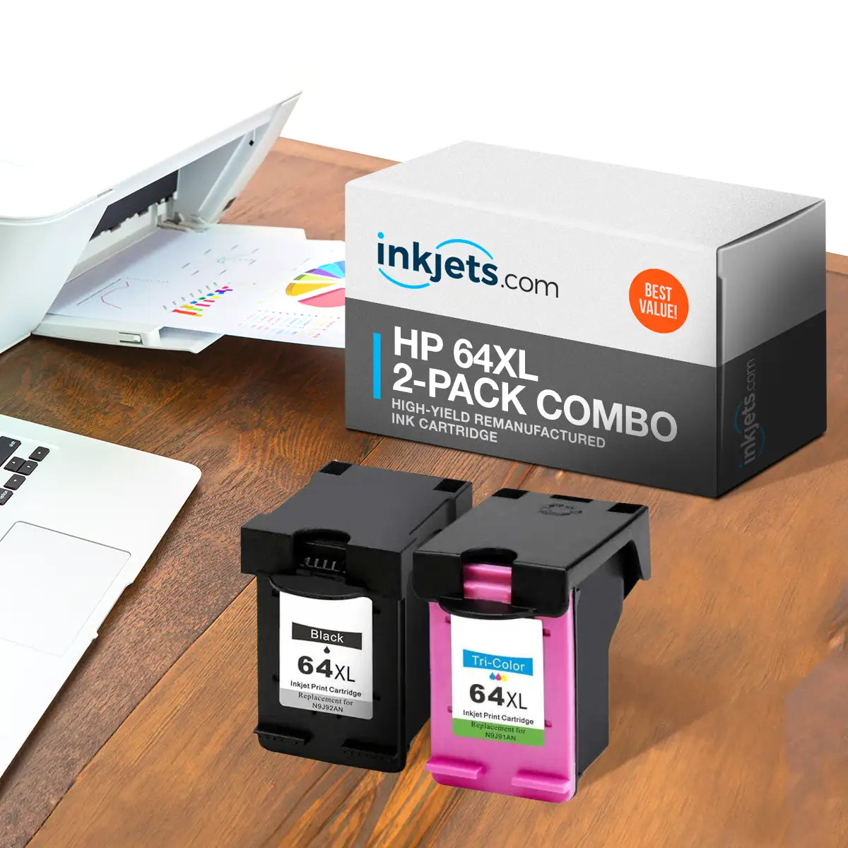 With the high costs of original HP ink cartridges today switching to our Remanufactured HP 64XL Ink Combo Cartridge 2-piece is a smart decision. This Remanufactured multi-pack costs less than its OEM counterpart but offers the same exceptional print quality and reliable performance. So why settle on expensive OEM HP ink cartridges if our compatibles work just as good? And if these are not enough to convince you we offer a full-year warranty on all our Remanufactured HP ink cartridges for your peace of mind.