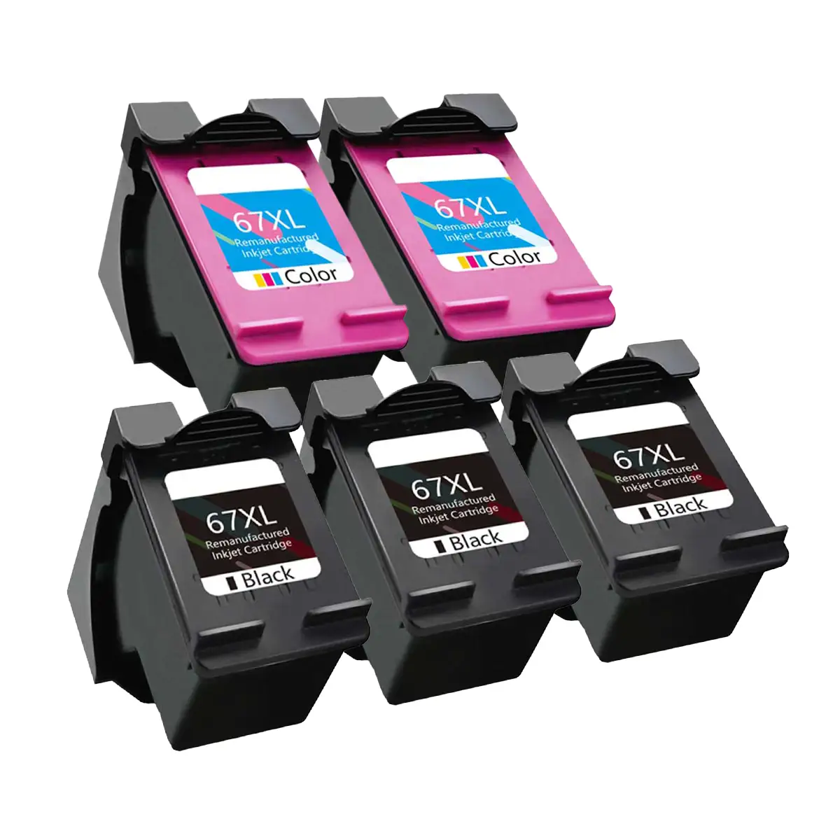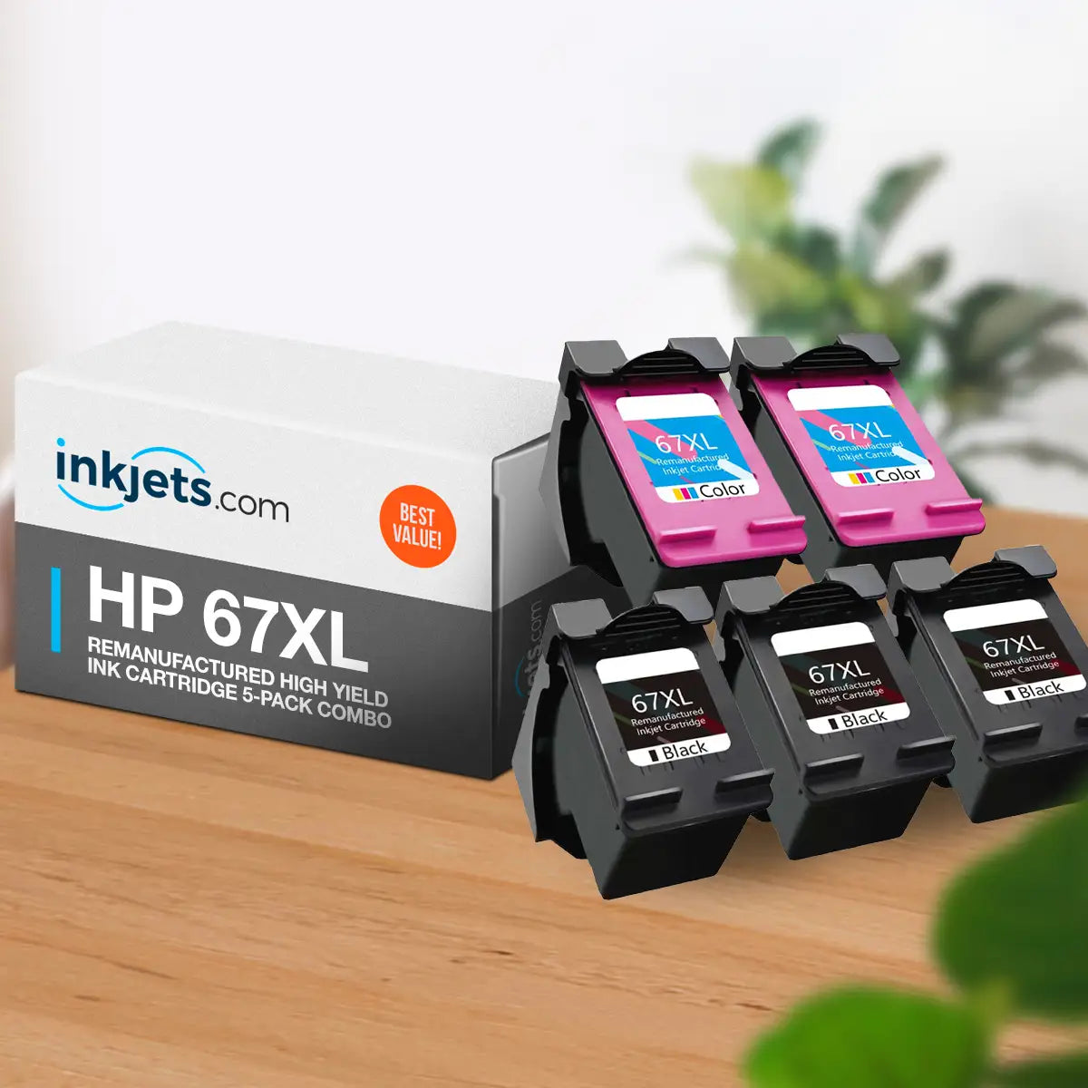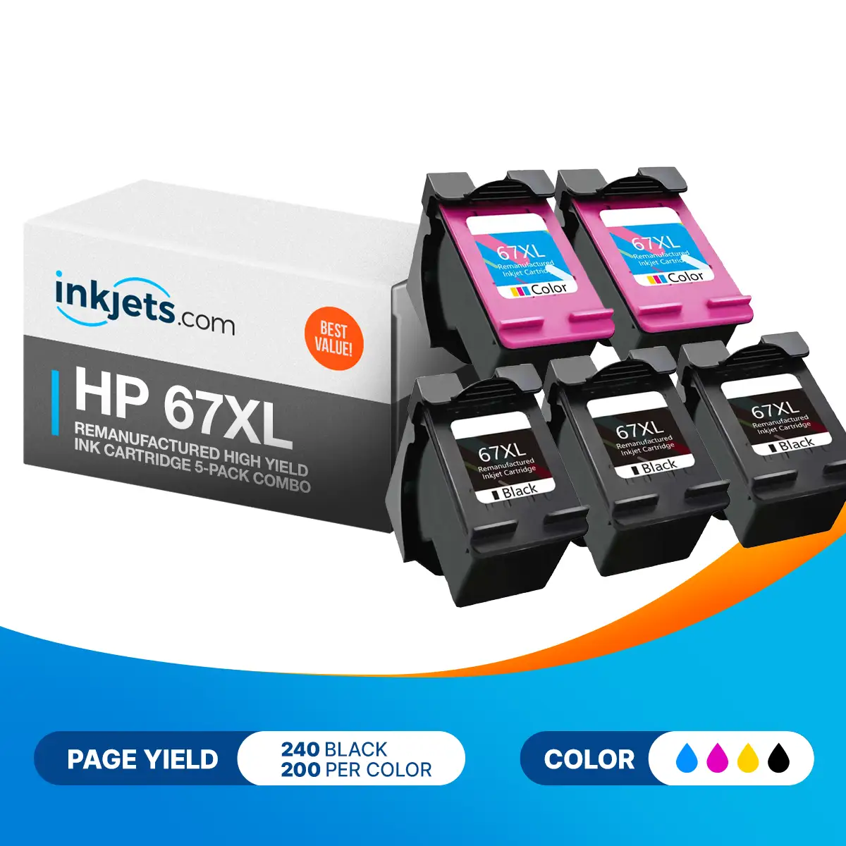 Our HP 67XL Remanufactured High Yield Ink Cartridge 5-Piece Combo Pack is a great choice to have plenty of ink for those customers who like to print in volume. This combo packs comes with 5 ink cartridges all high yield or XL. The XL means they contain more ink than your standard ink cartridge. This combo pack comes with 3 high yield black ink cartridges and 2 high yield color ink cartridges. Each of the black ink cartridges has an estimated page yield of 240 pages while each of the color ink cartridges has a estimated page yield of 200 pages.