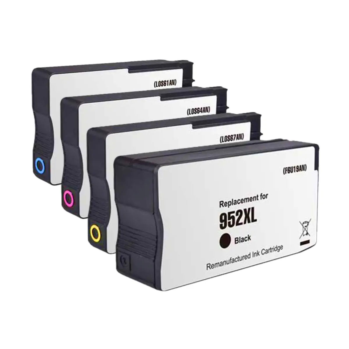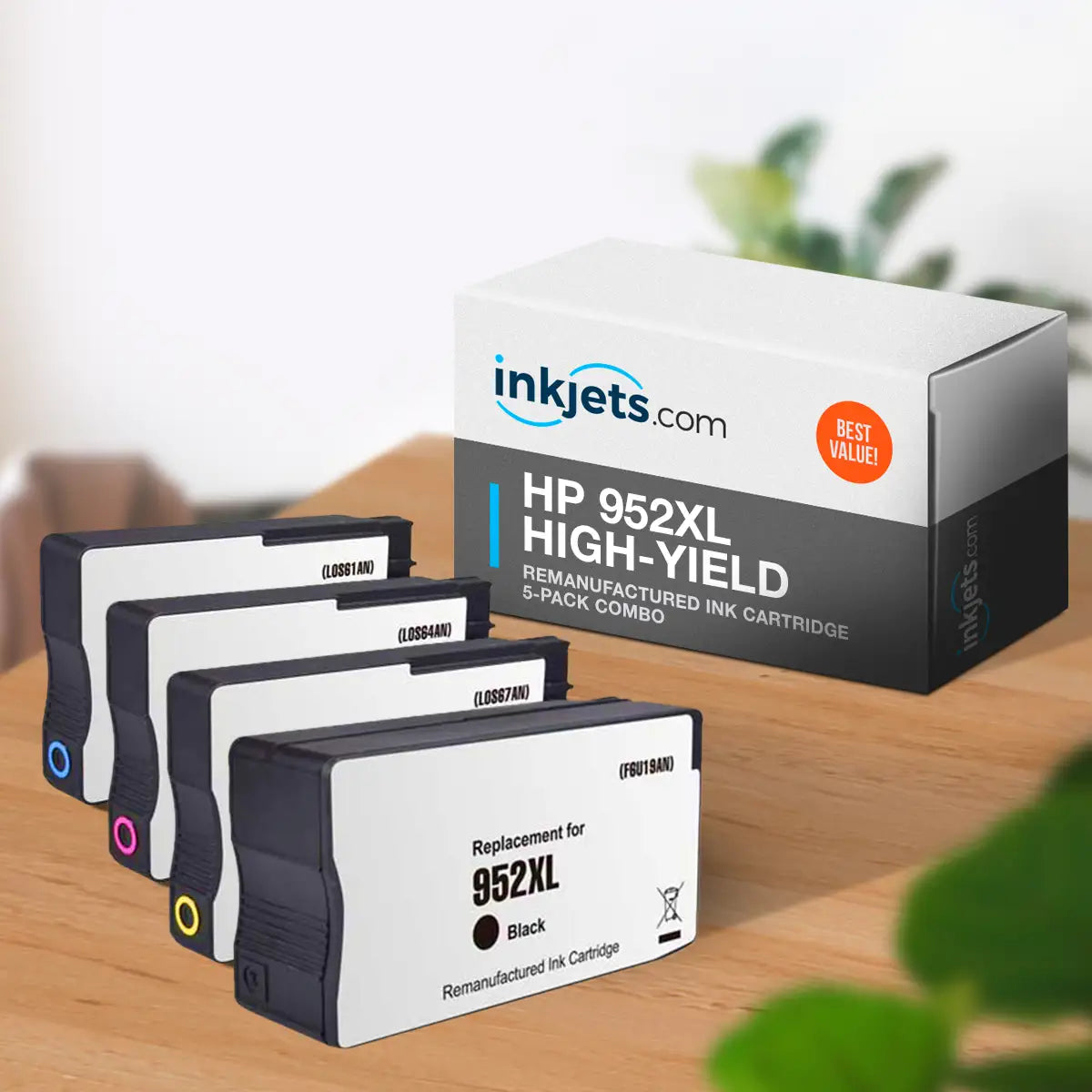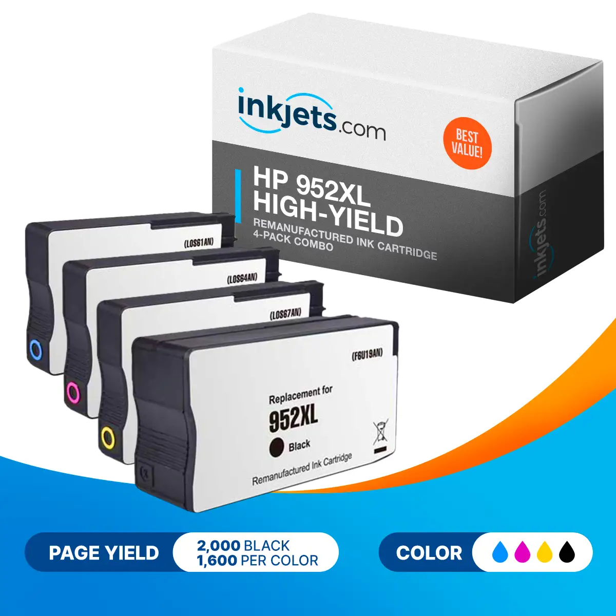 The HP 952XL Remanufactured High Yield Ink Cartridge 4-Pack from Inkjets.com contains 4 high-quality remanufactured 952XL cartridges. Each remanufactured cartridge in this combo pack is manufactured according to strict quality standards and is guaranteed to meet or even exceed the performance of other brands. This set replaces the original HP 952XL ink cartridge and is compatible with printers like the OfficeJet 7740, OfficeJet Pro 8726, OfficeJet Pro 8735 and more. See other compatible printers below.