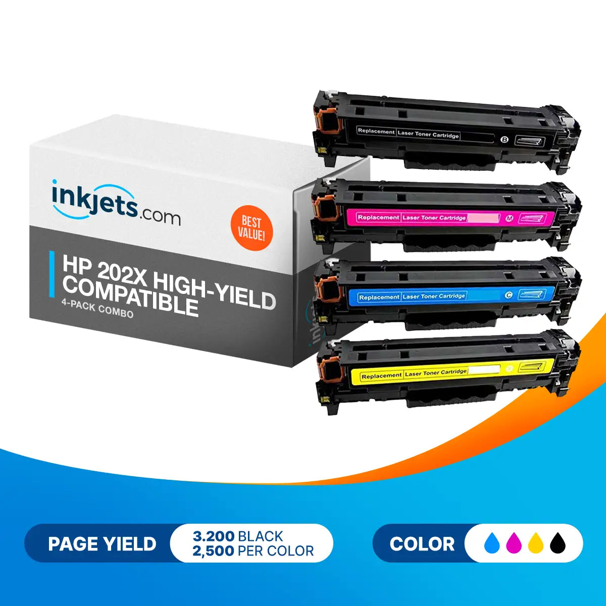 With the Compatible HP 202X Toner Cartridge High-Yield 4-Piece Combo Pack you have everything you need to create the highest quality color prints. It comes with one black cartridge offering an impressive 3200-page yield and one cyan magenta and yellow cartridge each providing up to 2500. At high yield capacity they can expertly deal with any print job no matter how big or complex. But that's not all—they can produce the clearest and most vibrant color output. If not for this combo pack's affordable price tag you'd mistake them for OEMs.