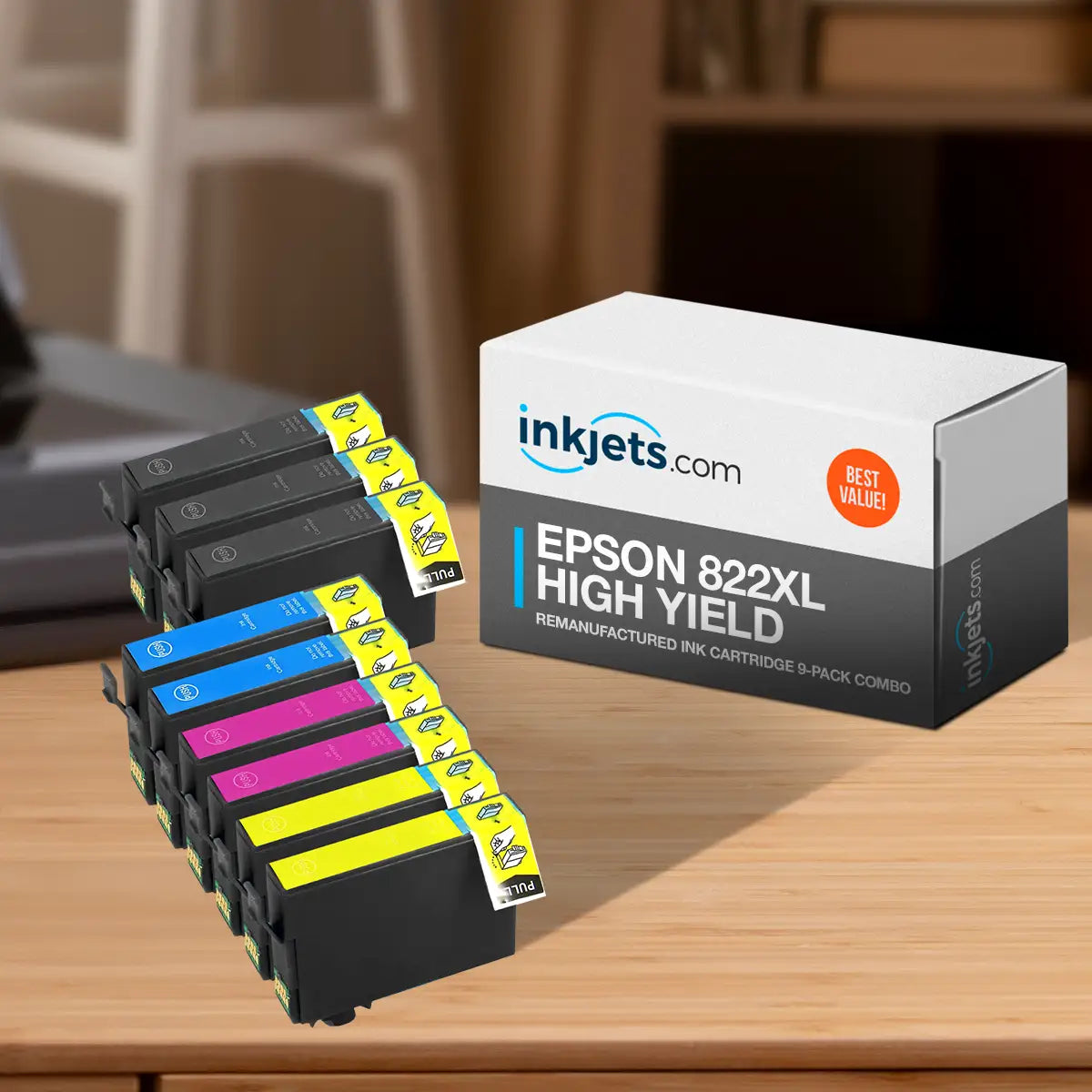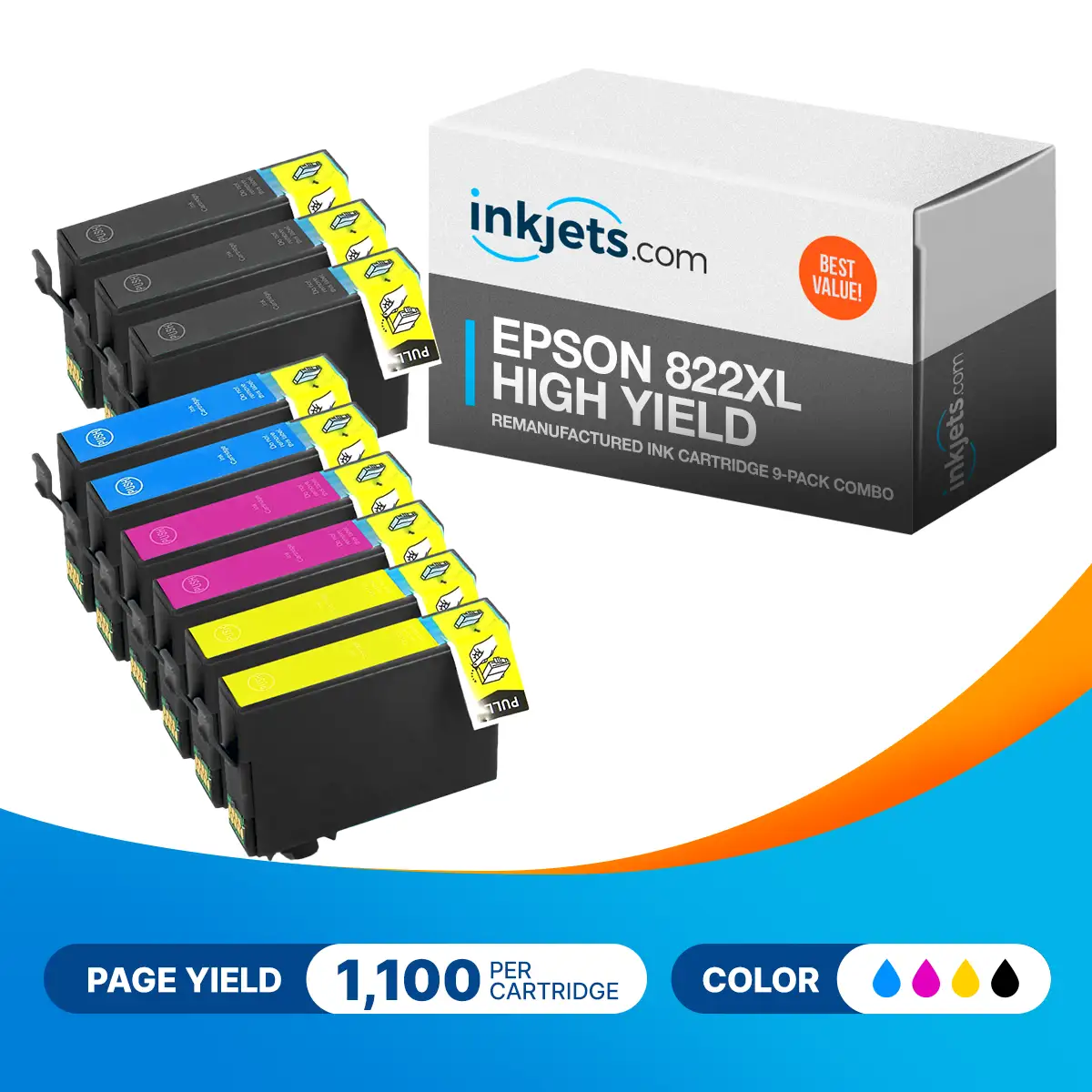 This Epson 822XL Remanufactured High Yield Ink Cartridge 9-Piece Combo Pack from Inkjets.com, containing 9 Remanufactured cartridges, is an excellent replacement for 822XL 9-Pack. Every ink cartridge in this bundle is made according to strict quality requirements and is proven to equal or even outperform competing brands. If your printer is one of the models listed below, including WorkForce Pro WF-3820, WorkForce Pro WF-4820, and more, then this aftermarket Epson 822XL 9-Pack ink cartridge will work with it seamlessly.