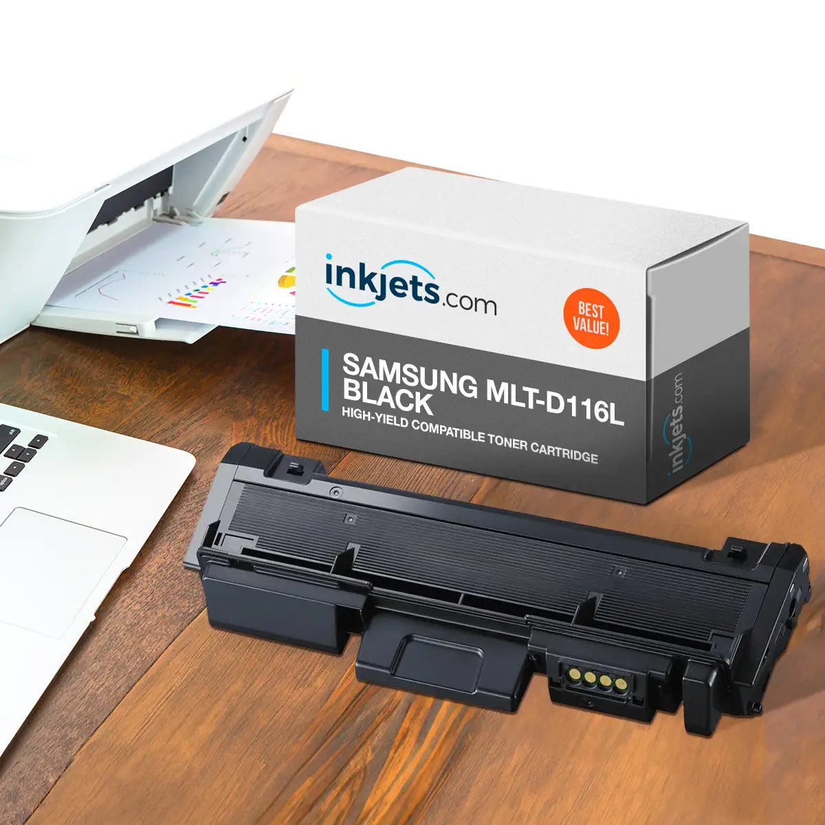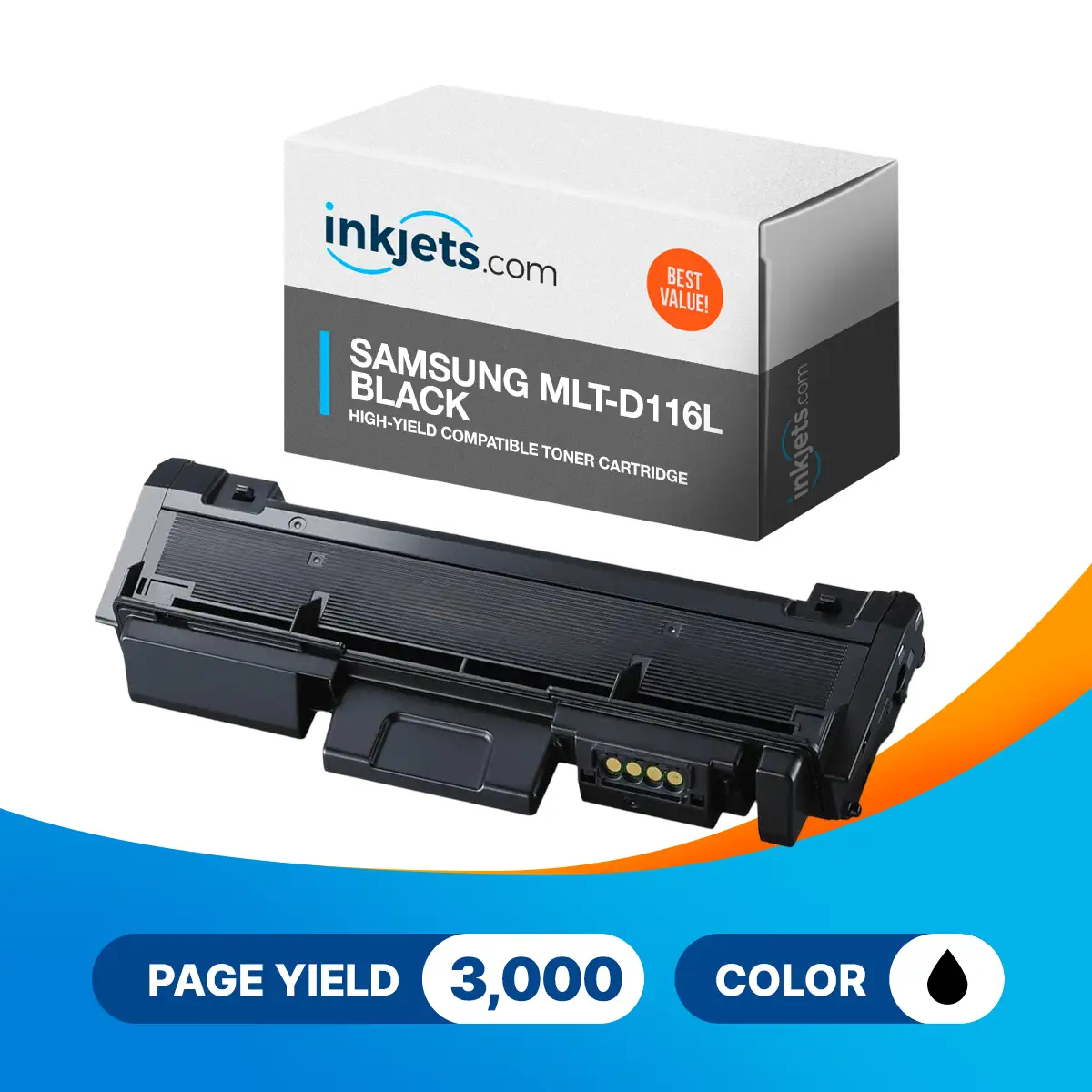 The Compatible Samsung MLT-D116L Toner Cartridge from Inkjets.com can offer up to 3000-page yield making short work of your high-volume print job. At the same time this black high-yield cartridge can create the sharpest and most detailed monochrome output. But here's what's up—our option comes with a far more budget-friendly price allowing for greater savings.